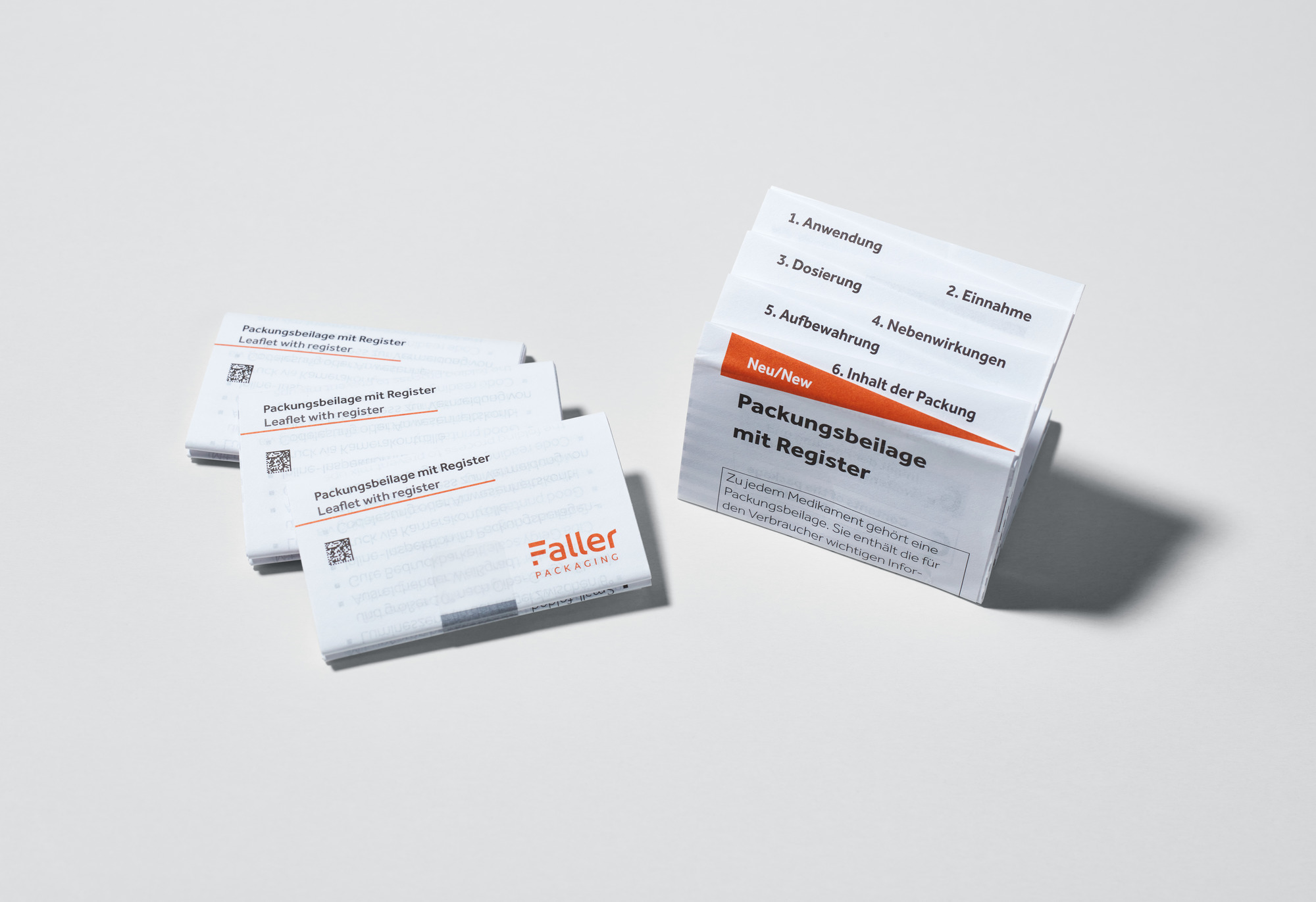 Traditional package inserts are often confusing, long and difficult to understand. Once unfolded, they are also difficult to put back into the packaging. Faller Packaging has developed a solution to this problem: the package insert with register. This can be divided, for example, into the headings required by the European Union: “Use,” “Intake,” “Dosage,” “Side Effects,” “Storage,” and “Package Contents” — or individually in consultation with the customer. In this way, the package insert provides optimum guidance: the required information can be found quickly, and the compact format means that the package insert can be easily stowed back in its original packaging. This makes handling easier and saves time in everyday life.