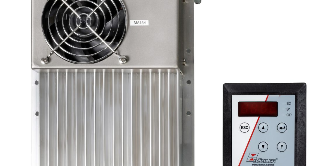 The new gas cooler series TC- kit (+) from Bühler Technologies eliminates these extra efforts. Peltier elements as temperature transmitter are the middle part of a sandwich consisting of a heat sink with integrated fan forming the outer part and a cooling block with exchangeable heat exchangers and the attached electrical terminals as the inner part. For the installation a cut out has to be made at the appropriate side wall of the cabinet.