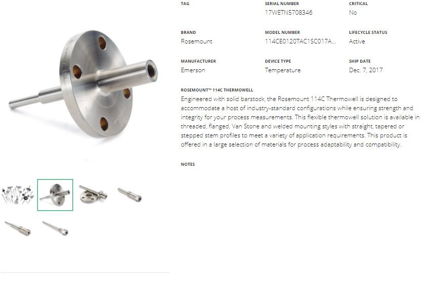 Up-to-date man­u­fac­tur­er infor­ma­tion is con­nect­ed to installed prod­ucts by ser­i­al num­ber, ensur­ing con­fi­dence in spare and replace­ment parts selec­tion. At release, infor­ma­tion for over 10 mil­lion Emer­son prod­ucts, cov­er­ing five years of fac­to­ry ship­ments, is already inte­grat­ed with the MyAs­sets data­base. MyAs­sets is also con­nect­ed to online engi­neer­ing and pro­cure­ment tools in MyE­mer­son, mak­ing it easy for main­te­nance plan­ners to man­age lead time and deliv­ery of parts.