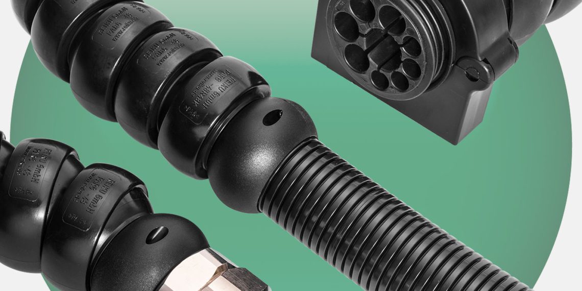 Among the many accessories available for both sizes are, for example, adapters that ensure an unproblematic changeover from the corrugated conduit to jointed tubing. With special protectors, corrugated tubing can be quickly and reliably extended at places subjected to a higher load with the aid of a jointed tubing. Easily mounted gripping clamps with support jaws offer a flexible possibility for fixing the jointed tubing. Separable joints allow the application-specific extension of tubing systems, also in combination with closed joints. Furthermore, separable connectors that can be combined with different end-pieces serve to connect jointed tubing quickly and easily with housings. Special joint connections for robots allow stable, tear-resistant, impact-resistant assembly in the gripping clamp, and can, for example, be combined with a cable star as strain relief. For applications subjected to particularly high mechanical stresses, the company has also developed a metal connection fitting with strain relief.