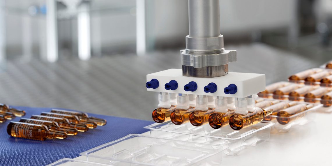 “For blis­ters, ampoules, syringes or injec­tion vials, we offer suc­tion pads with small diam­e­ters. Our grip­pers can, for exam­ple, grip small glass jars con­tain­ing vac­cine extreme­ly gen­tly and with­out con­t­a­m­i­na­tion. In the logis­tics cen­ter, one employ­ee often moves a large num­ber of these pack­ages man­u­al­ly and at high cycle rates. Over the course of the day, he thus car­ries loads of sev­er­al 100 kilograms.”