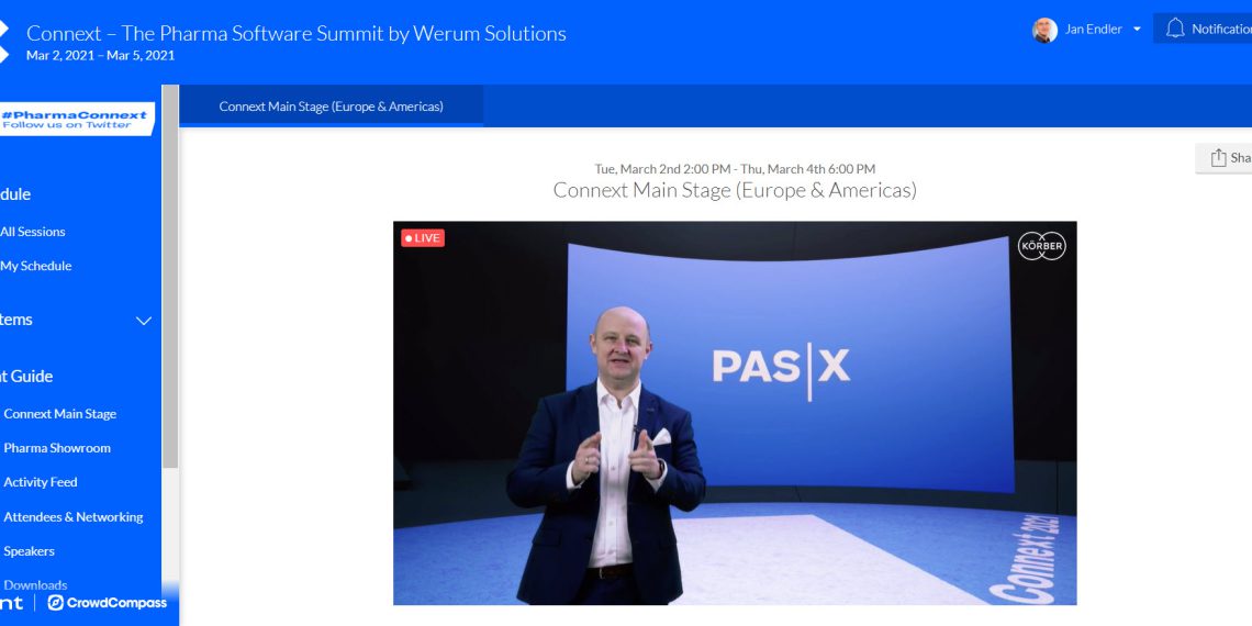 Con­next brings togeth­er phar­ma­ceu­ti­cal, biotech and cell & gene ther­a­py com­pa­nies that use Werum PAS‑X MES or are inter­est­ed in using Man­u­fac­tur­ing IT and Man­u­fac­tur­ing Intel­li­gence to dig­i­tal­ize their pro­duc­tion. The four-day online event evolved from the annu­al PAS‑X User Group Meet­ing (UGM) and the par­al­lel PFU meet­ing (PAS‑X for Us) and is orga­nized by the soft­ware experts of Kör­ber’s Phar­ma Busi­ness Area. For the first time, this PAS‑X Com­mu­ni­ty Event took place as a vir­tu­al online event.