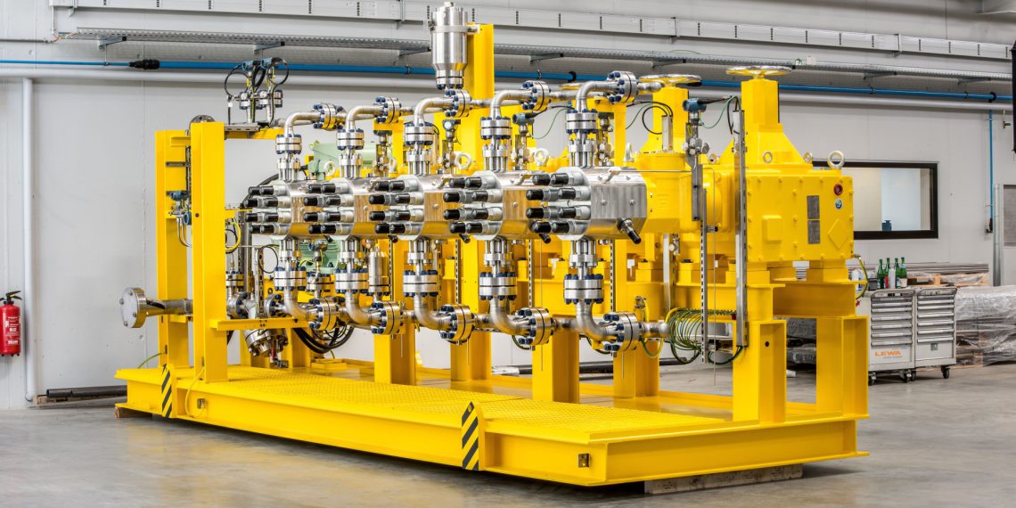 The twelve LDH5 series injection pumps, with corresponding M8 pump heads, consist of five coupled single powertrains. “Similarly to the preliminary project, the MEG continuously circulates between the platforms and the glycol regeneration units in the onshore preparation plants,” Figgle continues. “In the process of preventing methane hydrate accumulation, our injection pumps inject the MEG at the necessary points to eliminate ice formation in the drill holes. In addition to the pressure drops in the lines, these pumps must also overcome the back pressure from the source, which is why pressures of up to 600 bar must be expected.”