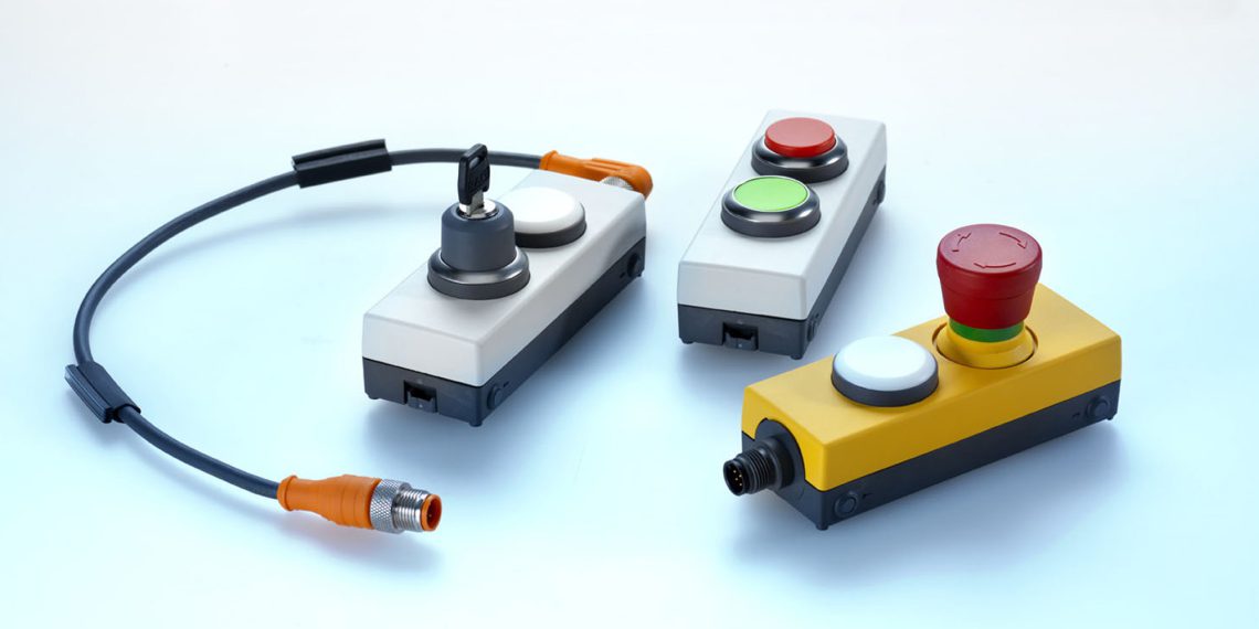 Variants are available with one emergency stop or pushbutton each, with emergency stop and pushbutton (or key switch, signal lamp) as well as other 2‑way combinations of pushbutton and selector switches. The connection provides users with a ready-to-use control unit that can be directly connected and put into operation without any wiring effort. With its compact dimensions of 109 mm x 40 mm x 29 mm, the housing is ideally suited for mounting on 40 mm profile rails of production equipment or safety fences.