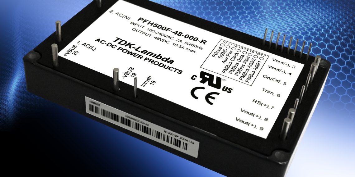 Now TDK Corporation (TSE 6762) also offers the TDK Lambda AC-DC power modules of the PFH500F series with 12V and 48V output voltage. The efficient modules with 504W output power are cooled via a baseplate, making them ideal for outdoor use. A PMBus™ interface allows both monitoring and programming of important parameters. The modules are thus predestined for use in waterproof and dustproof housings for LED displays, transmit amplifiers, environmental measurement technology and object monitoring.