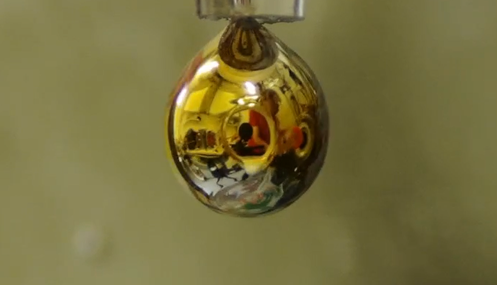 Inside a vacuum chamber, the researchers exposed a drop of sodium-potassium alloy to a small amount of water vapor, which began to condense on its surface. The electrons liberated from the alkali metal dissolved in the layer of water on the surface faster than the chemical reaction that results in the explosion. There were a sufficient number of them to overcome the critical limit for the formation of a conduction band and thus give rise to a metallic water solution, which in addition to the electrons also contained dissolved alkali cations and chemically formed hydroxide and hydrogen.